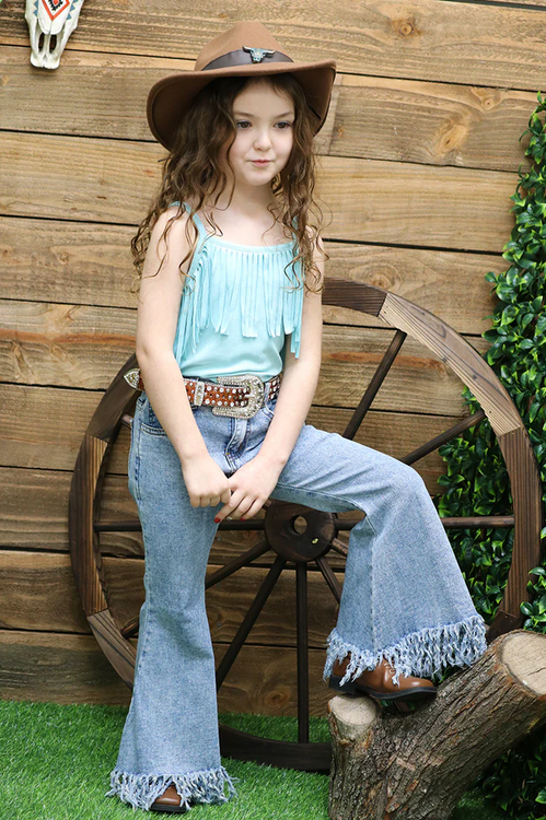 Description Girls' Bleached Distressed Denim Fringe Jeans Available in size 6-12 months to Girls' 10-12